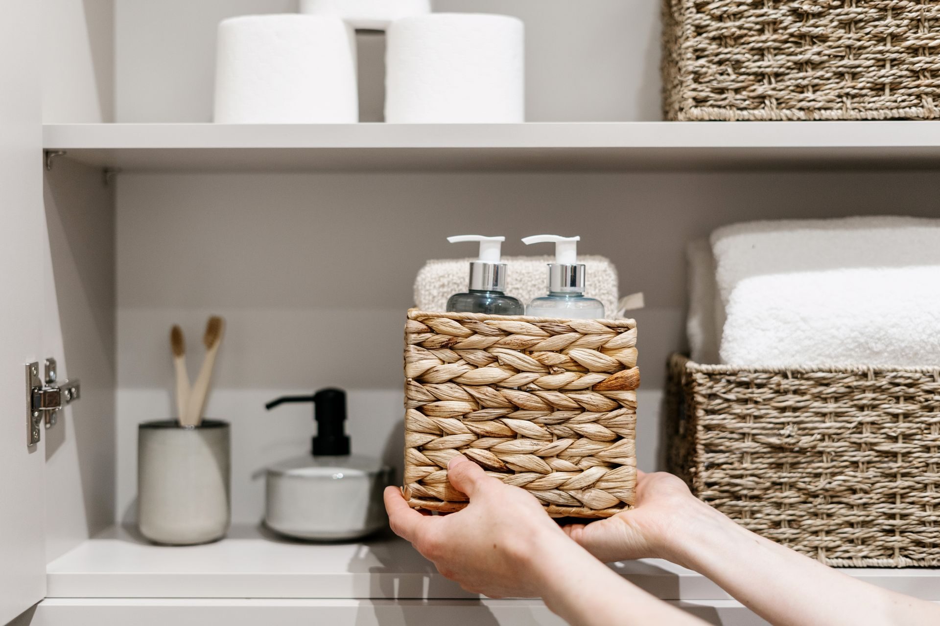 Nu begint het leukste gedeelte: het opnieuw inrichten van je badkamerkast. Geef alles wat blijft een vaste plek. Plaats de spullen die je dagelijks gebruikt vooraan en zet extra of seizoensgebonden spullen achterin.