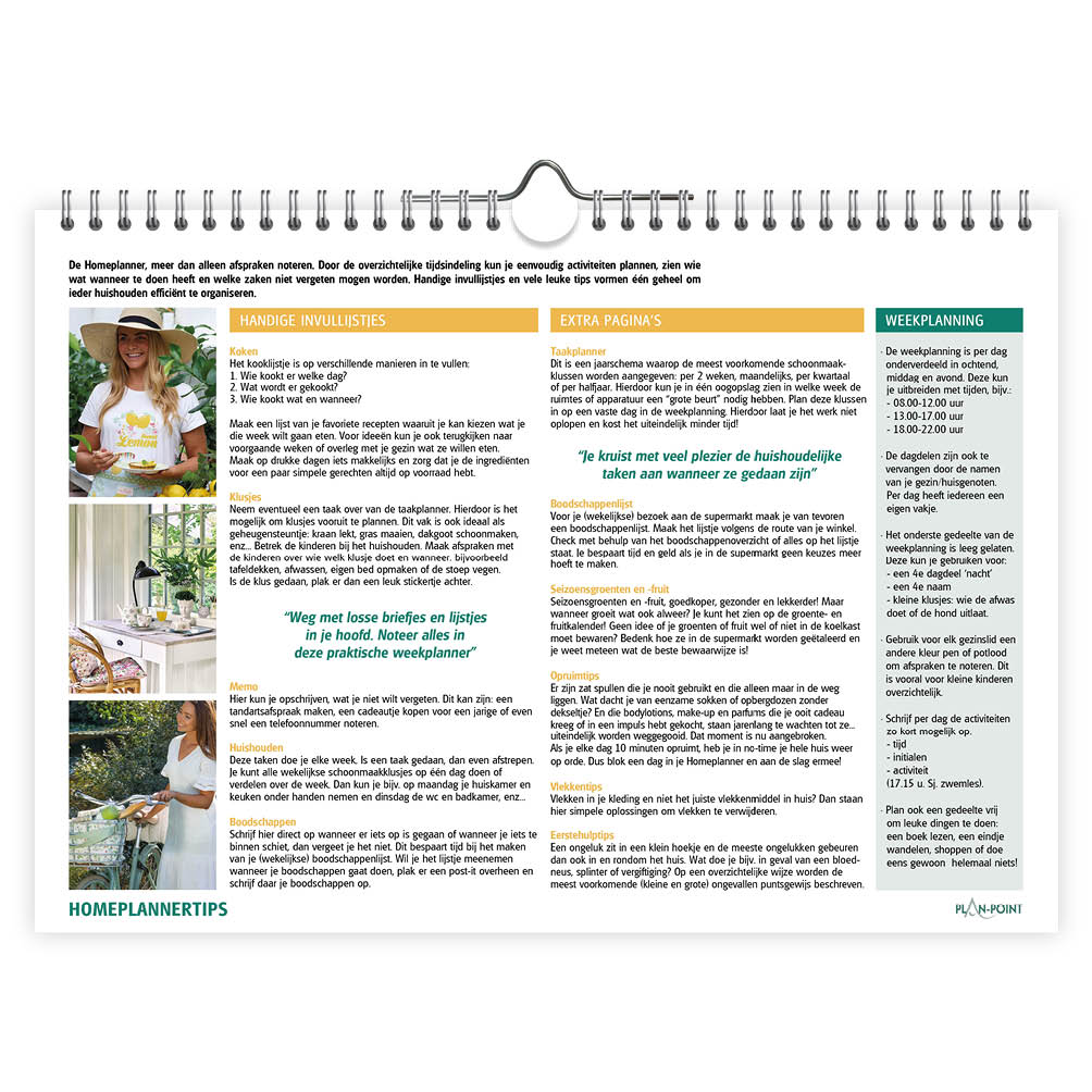 De Homeplanner, meer dan alleen afspraken noteren. Door de overzichtelijke tijdsindeling kun je eenvoudig activiteiten plannen, zien wie wat wanneer te doen heeft en welke zaken niet vergeten mogen worden. Handige invullijstjes en vele leuke tips vormen één geheel om ieder huishouden efficiënt te organiseren.