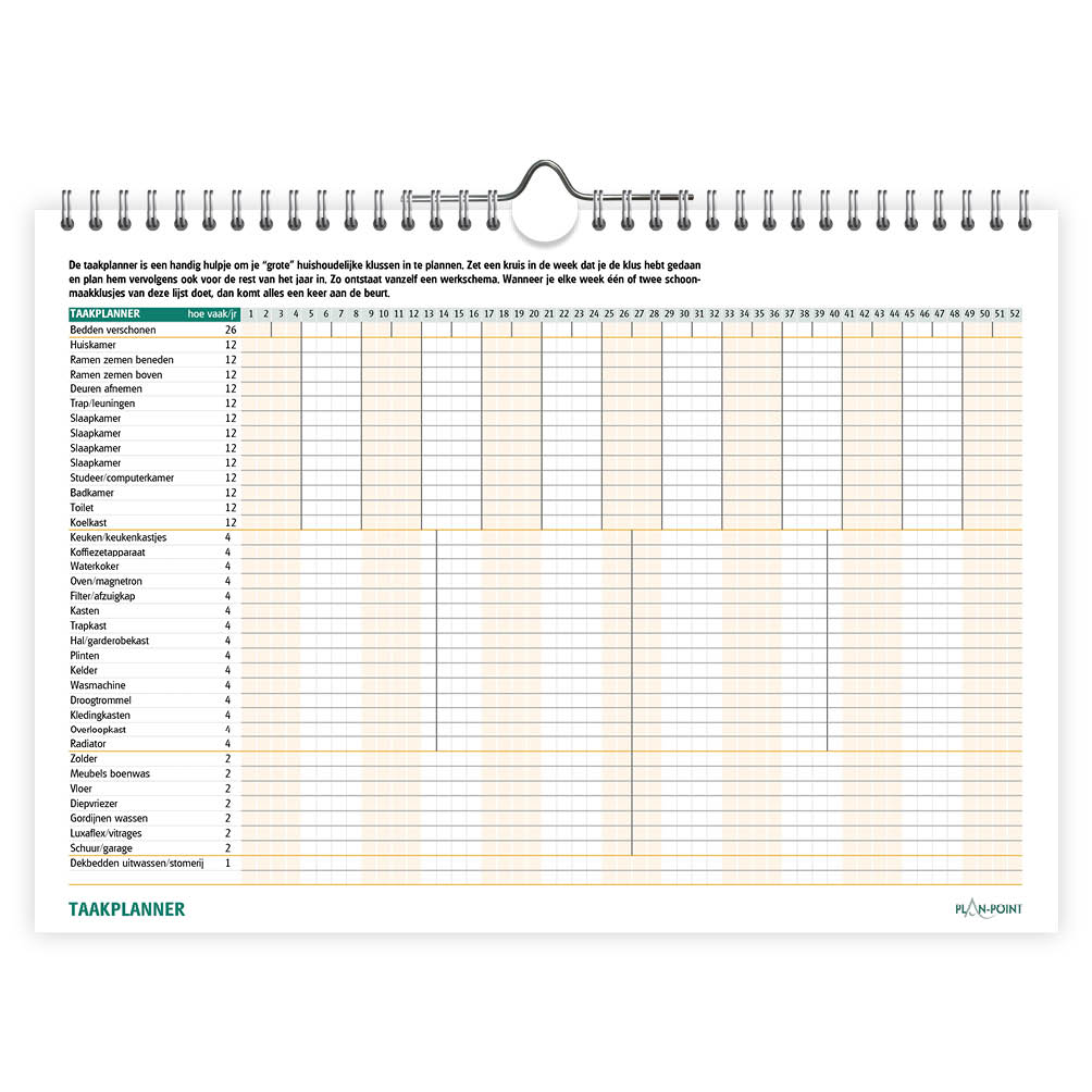 Taakplanner overzicht: Dit is een jaarschema waarop de meest voorkomende schoonmaakklussen worden aangegeven: per 2 weken, maandelijks, per kwartaal of per halfjaar. Hierdoor kun je in één oogopslag zien in welke week de ruimtes of apparatuur een “grote beurt” nodig hebben. Plan deze klussen in op een vaste dag in …
